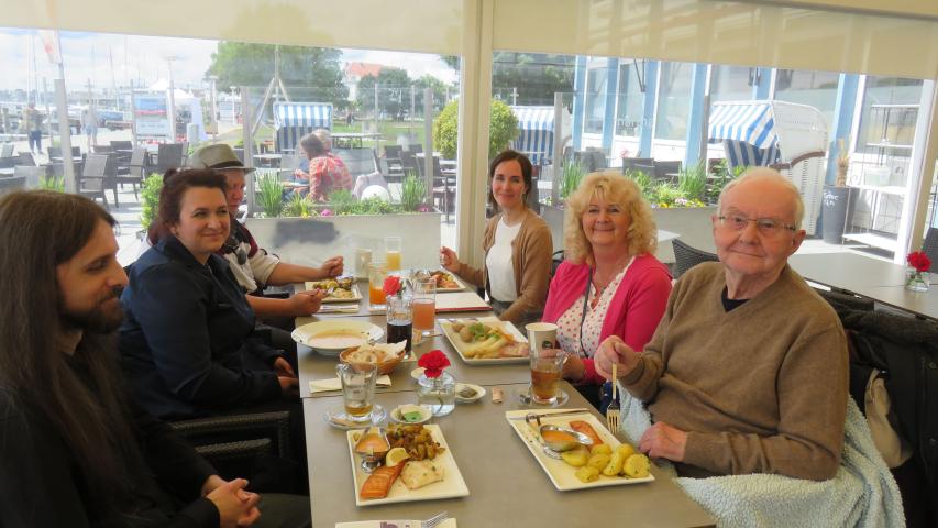 Als wir in Travemünde angekommen sind, warteten schon drei Enkelkinder und der Freund der Familie. Zuerst wurde das Restaurant Marina besucht, in dem sie viel erzählt und zusammen gespeist haben. Nach dem Mittagessen machte Herr M. ein kleines Nickerchen im Wünschewagen. Der Tagesablauf sollte so sein wie immer.