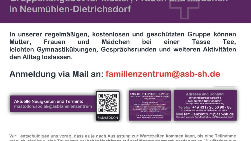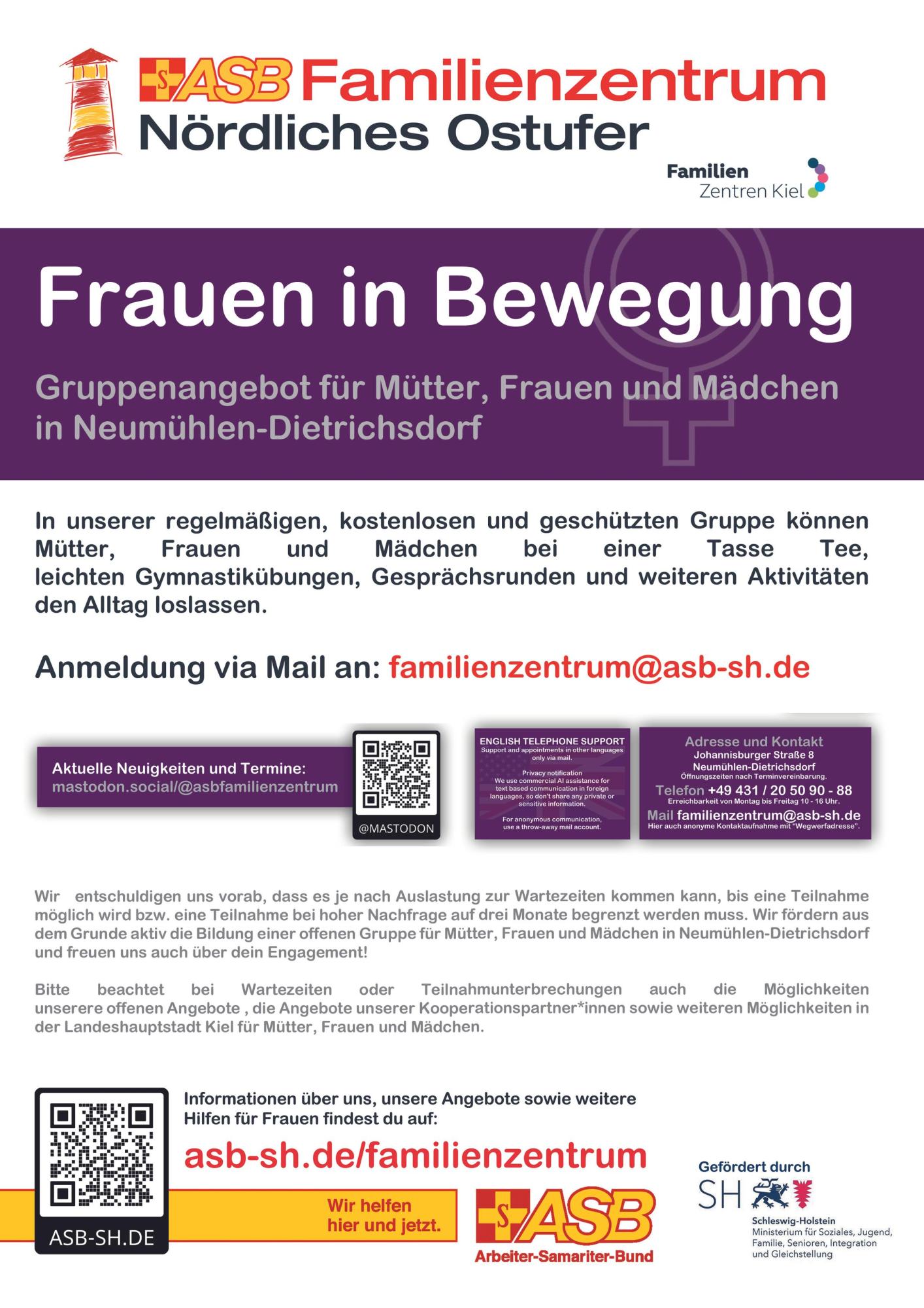 Das ASB Familienzentrum Nördliches Ostufer ist eine durch das Ministerium für Soziales, Jugend, Familie, Senioren, Integration und Gleichstellung des Landes Schleswig-Holstein geförderte ergänzende Koodinationsstelle im psychosozialen Unterstützungsystem für Familien* im Sozialraum Nördliches Ostufer und der Landeshauptstadt Kiel.
